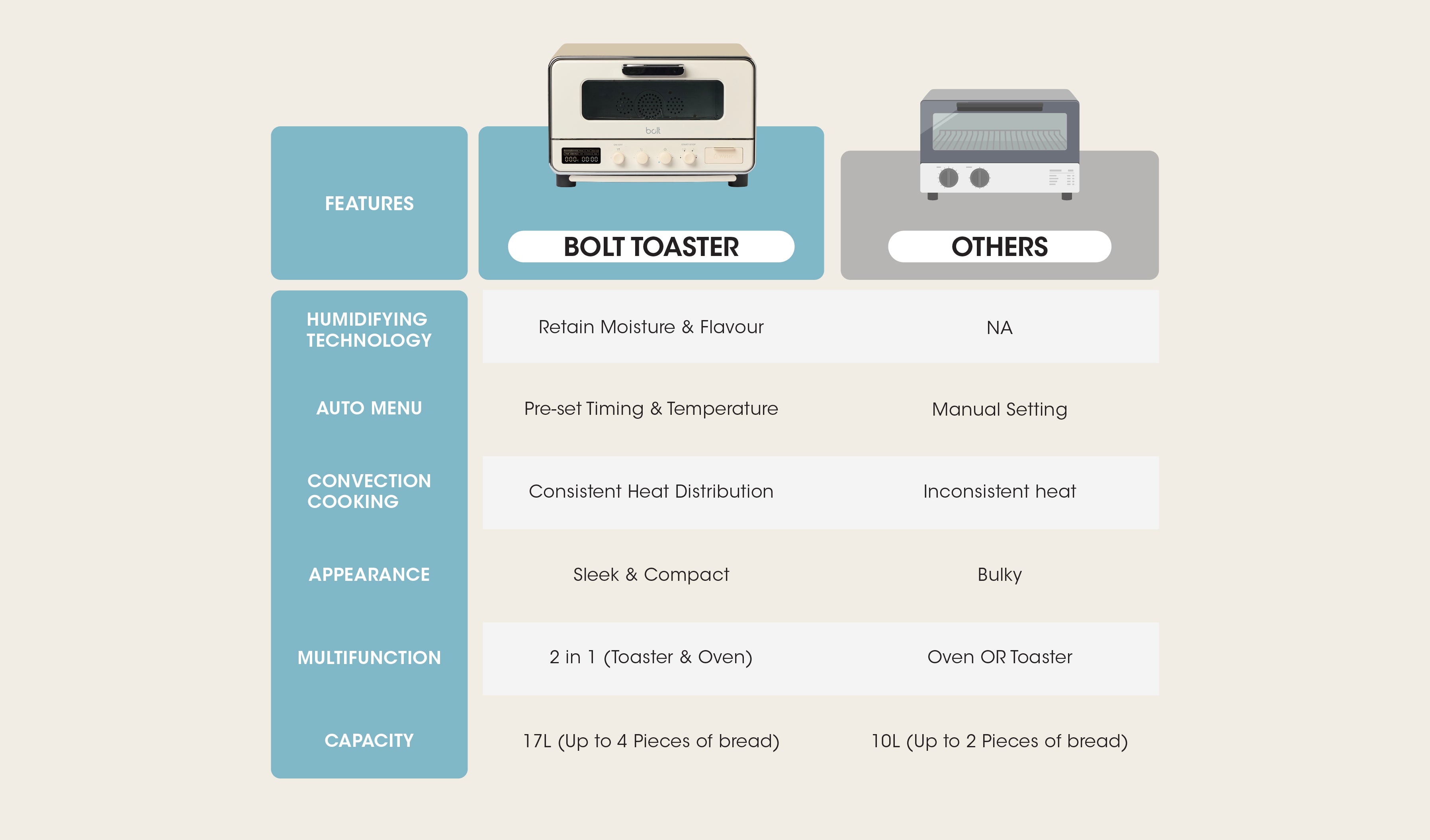 With Bolt Toaster, achieve the perfect texture for toasts. The humidifying technology helps to prevent bread from drying out and retains moisture - ensuring a golden brown crisp on the outside and soft fluffy texture on the inside.